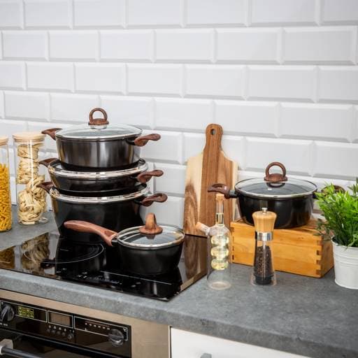 Komplet aus Pfannen und Töpfen mit Qualum Basic Stone Edition Beschichtung 10-teiliges Darkwood