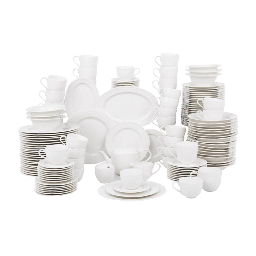 Das modernes Geschirrset weiß für 12 Personen enthält Teller, Schalen, Tassen, Untertassen und Serviergeschirr. Ein vollständiges Kombiservice für Mahlzeiten und Kaffeetafel – inklusive praktischem Zusatzteil.