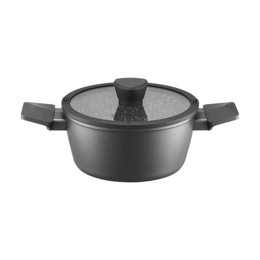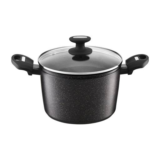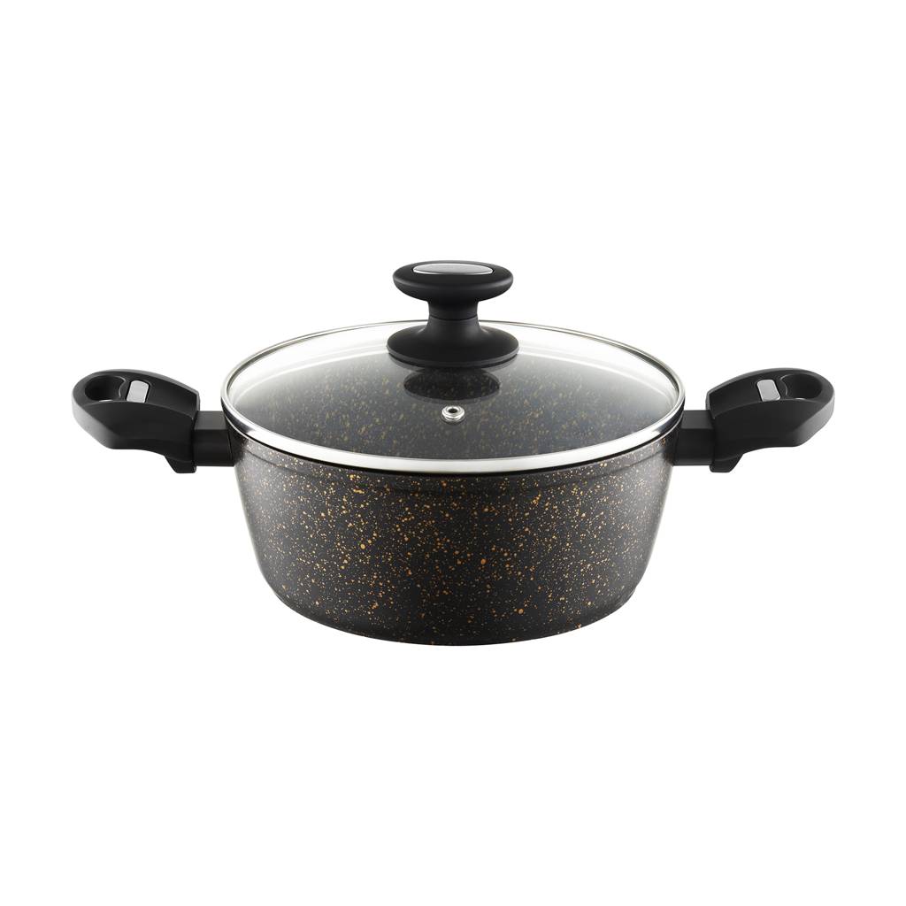 Die steinartige Oberfläche mit subtilen goldenen Partikeln verleiht dem Topf ein elegantes Aussehen. Das Gefäß präsentiert sich auch beim Servieren gut.