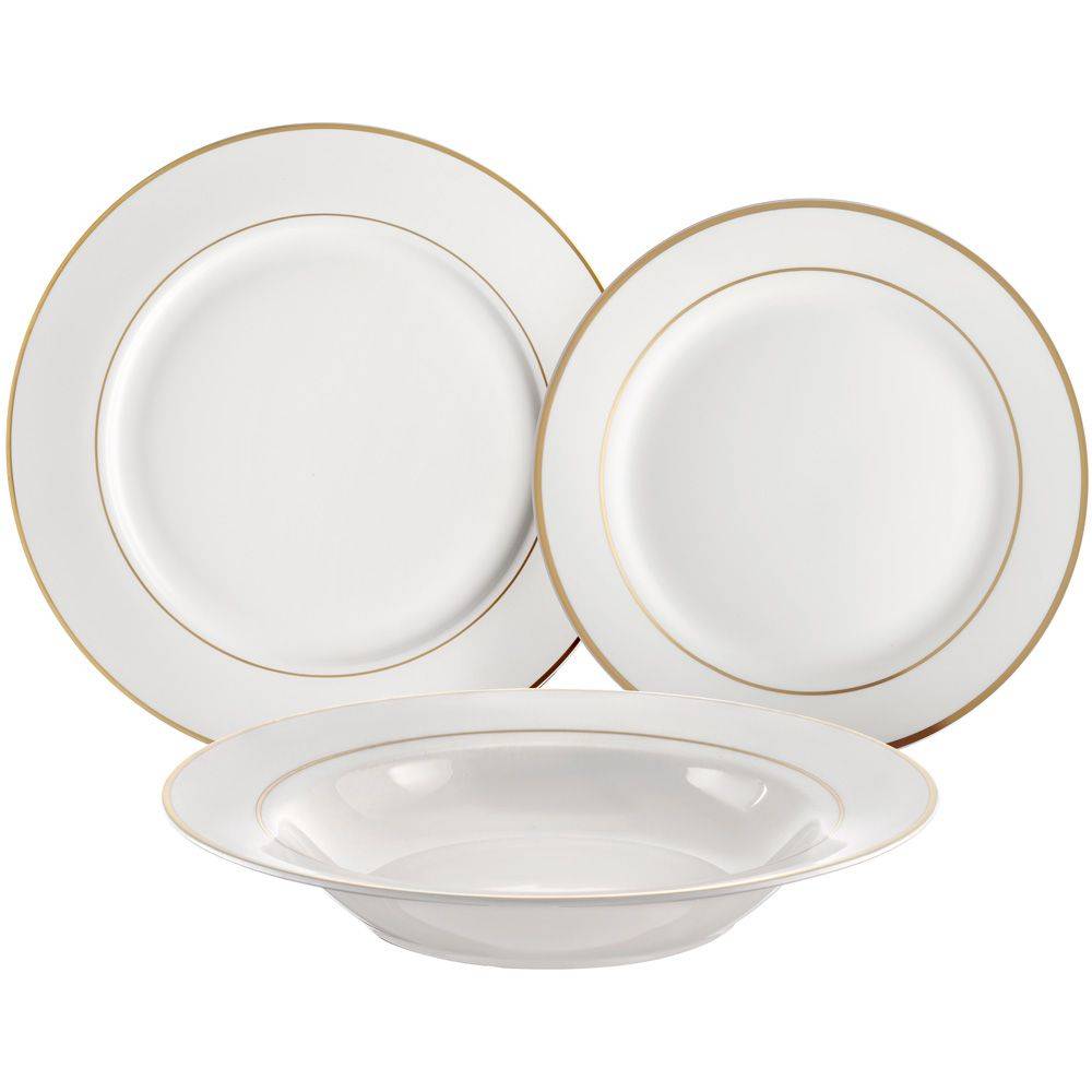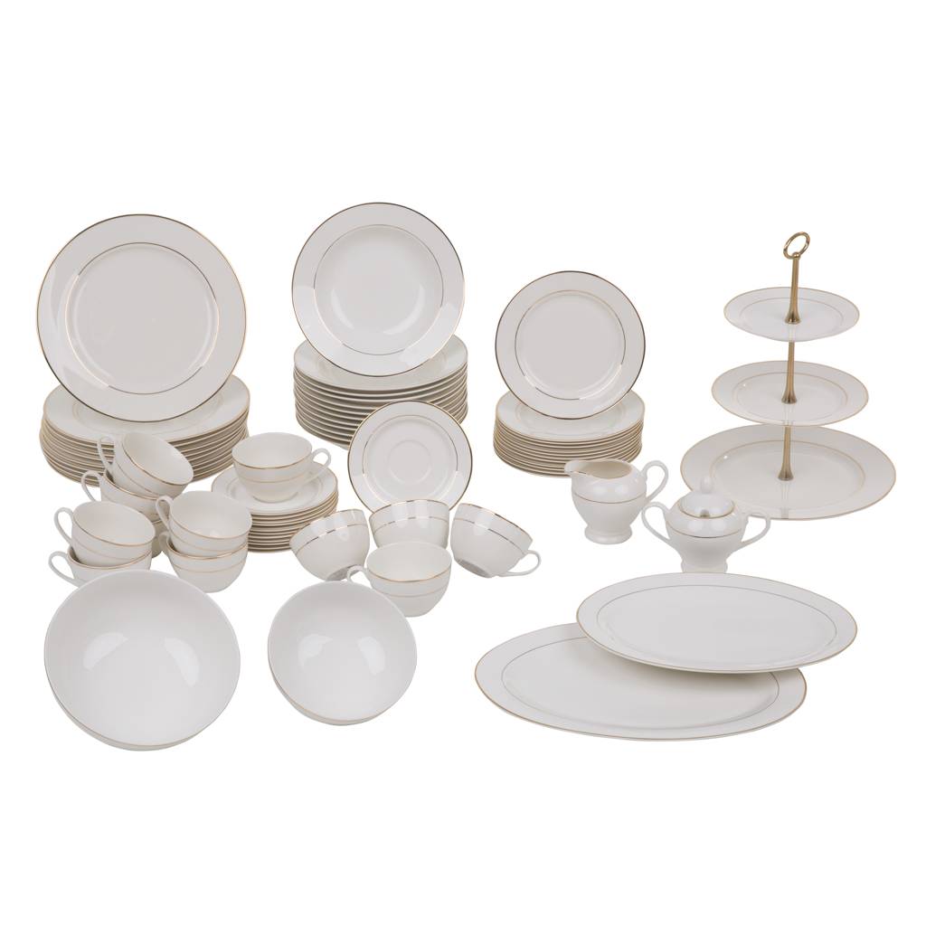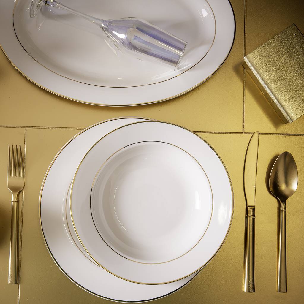 Eine feine goldene oder silberne Linie am Rand verleiht dem Service eine edle Note. Das klassische Geschirrset mit Goldrand sorgt für eine elegante Tischgestaltung und bringt einen Hauch von Luxus auf jede Tafel.
