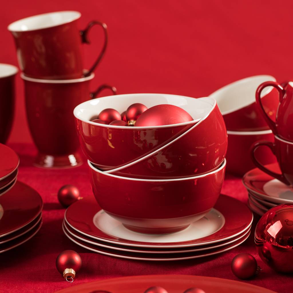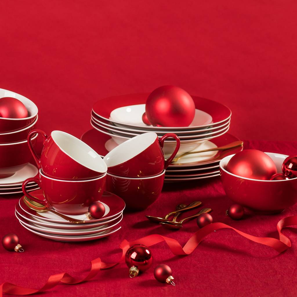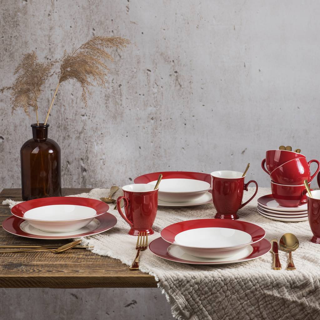 The combination of intense red and pure white makes the dinnerware a table adornment. The color scheme fits perfectly with arrangements of a festive atmosphere.