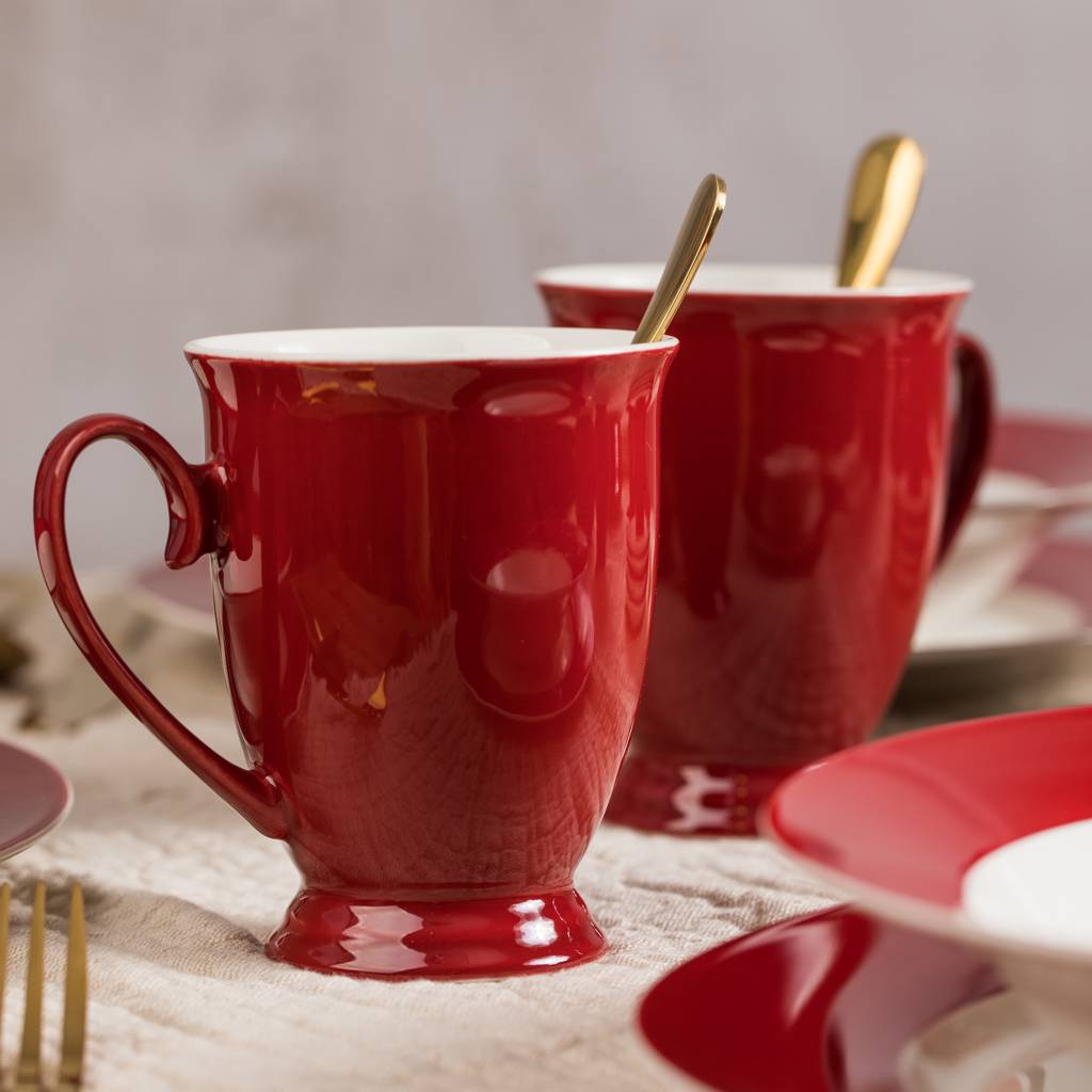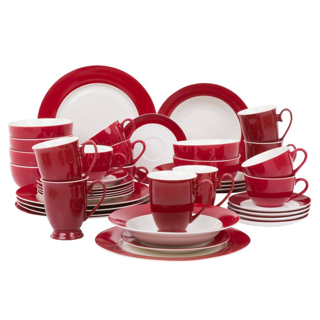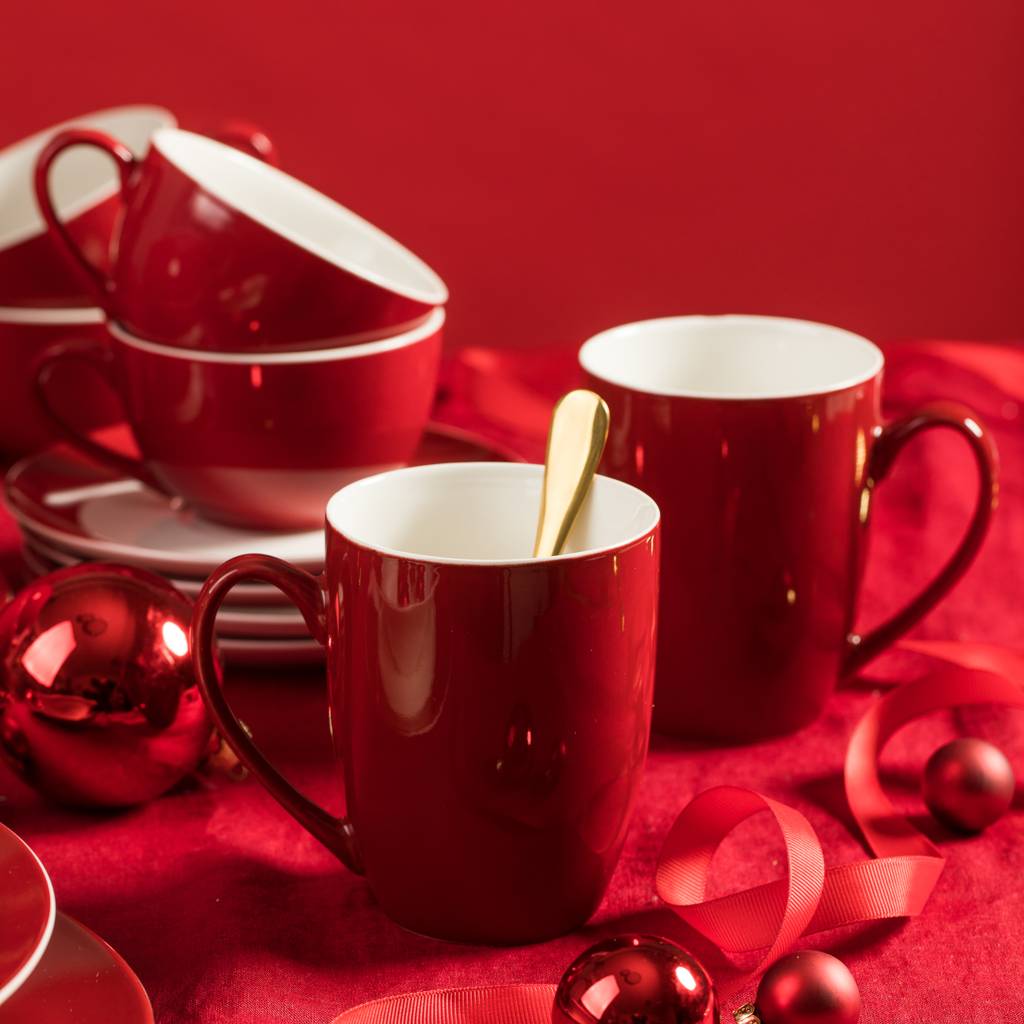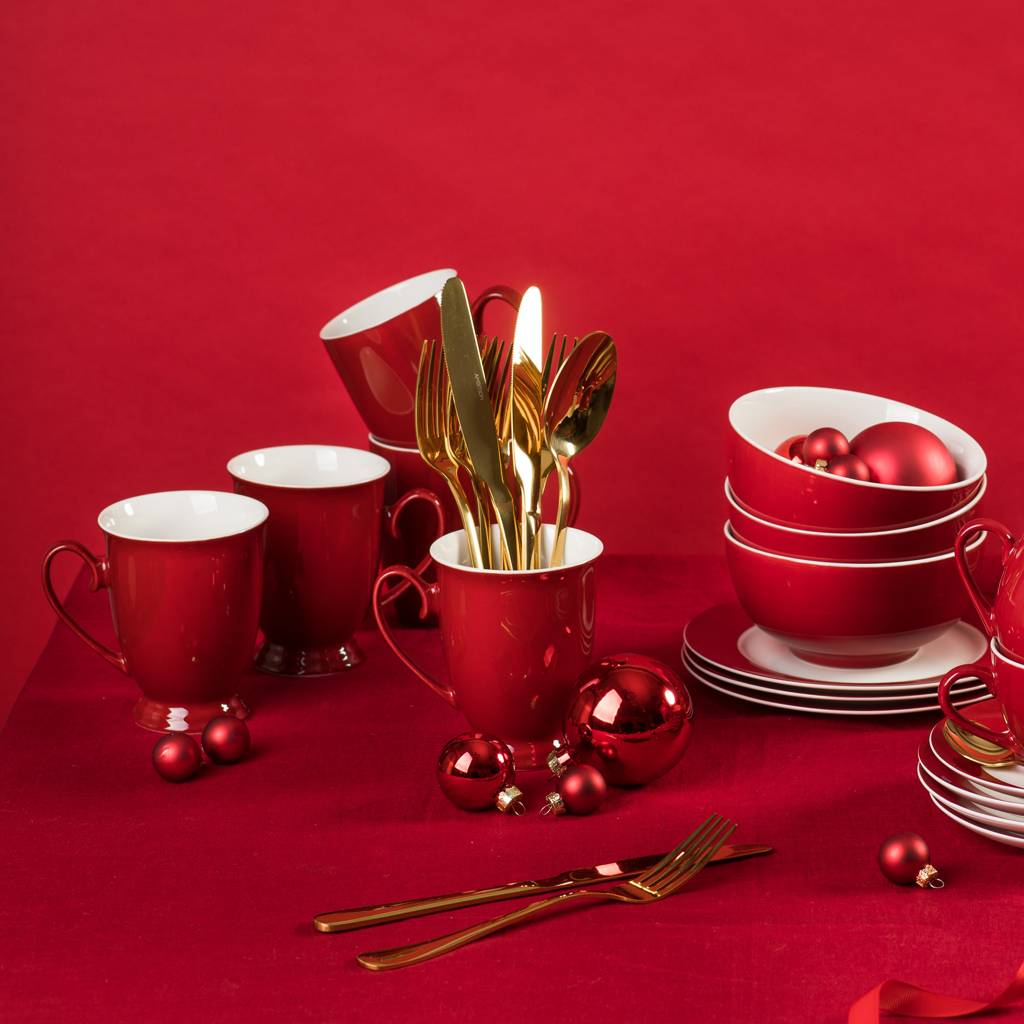 The combination of intense red and pure white makes the dinnerware a table adornment. The color scheme fits perfectly with arrangements of a festive atmosphere.