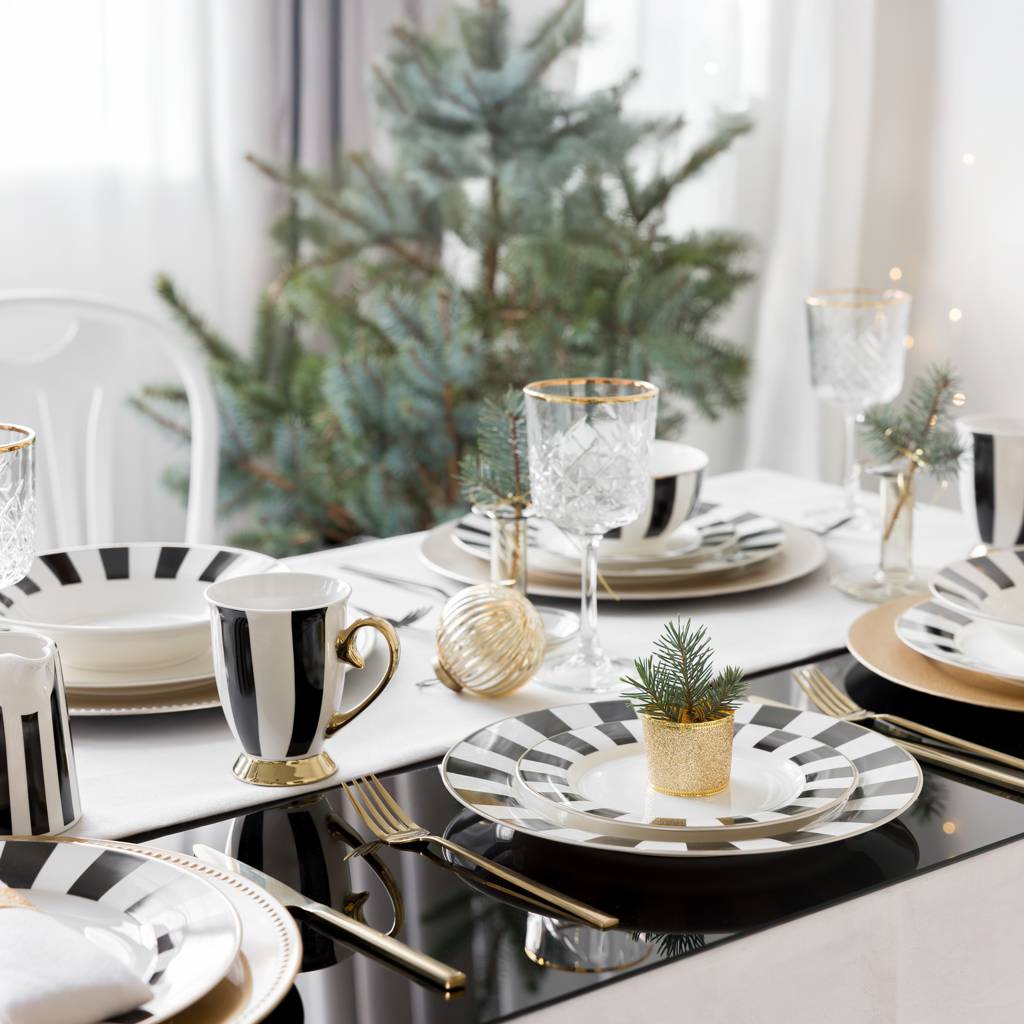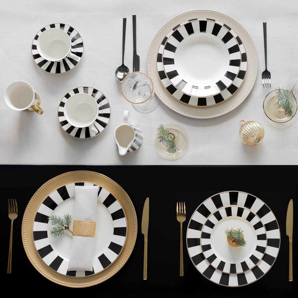 - Porcelain dessert plate Ribs: contrasting stripes and elegant gold accent
