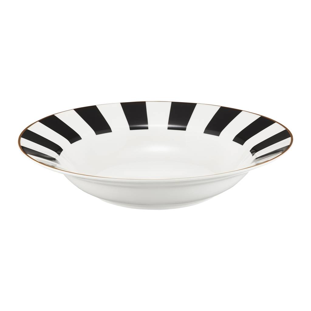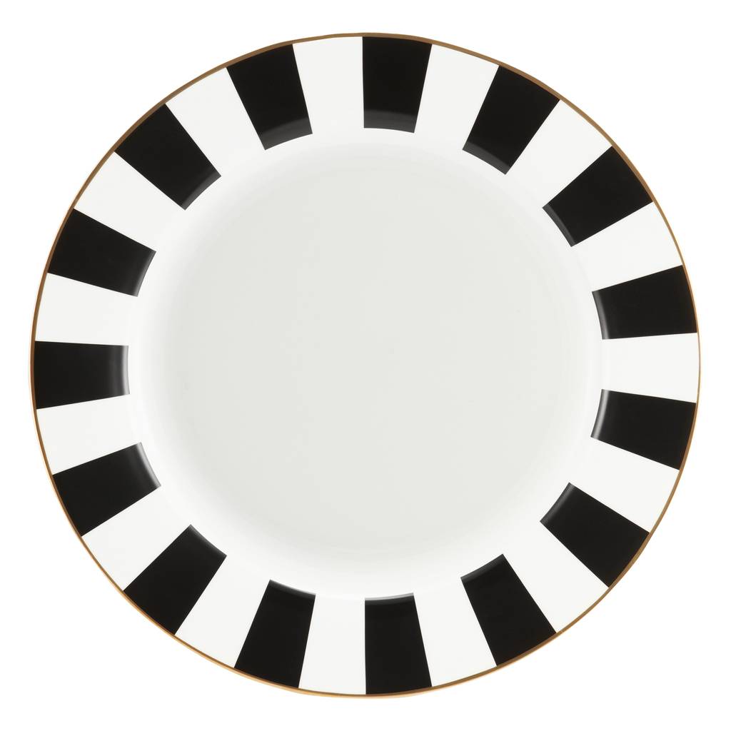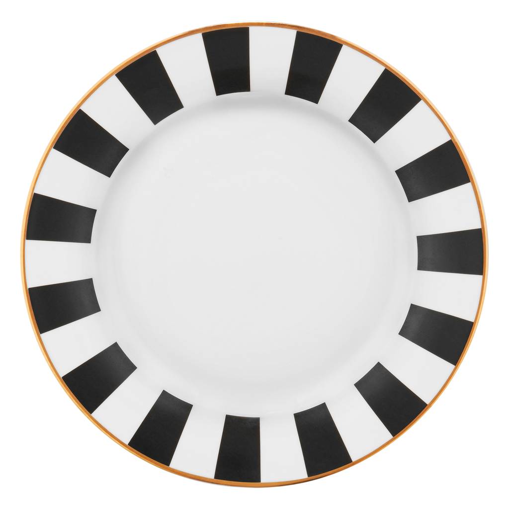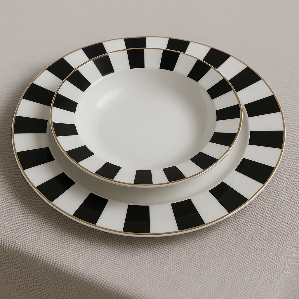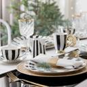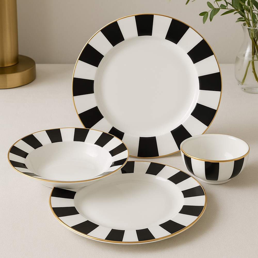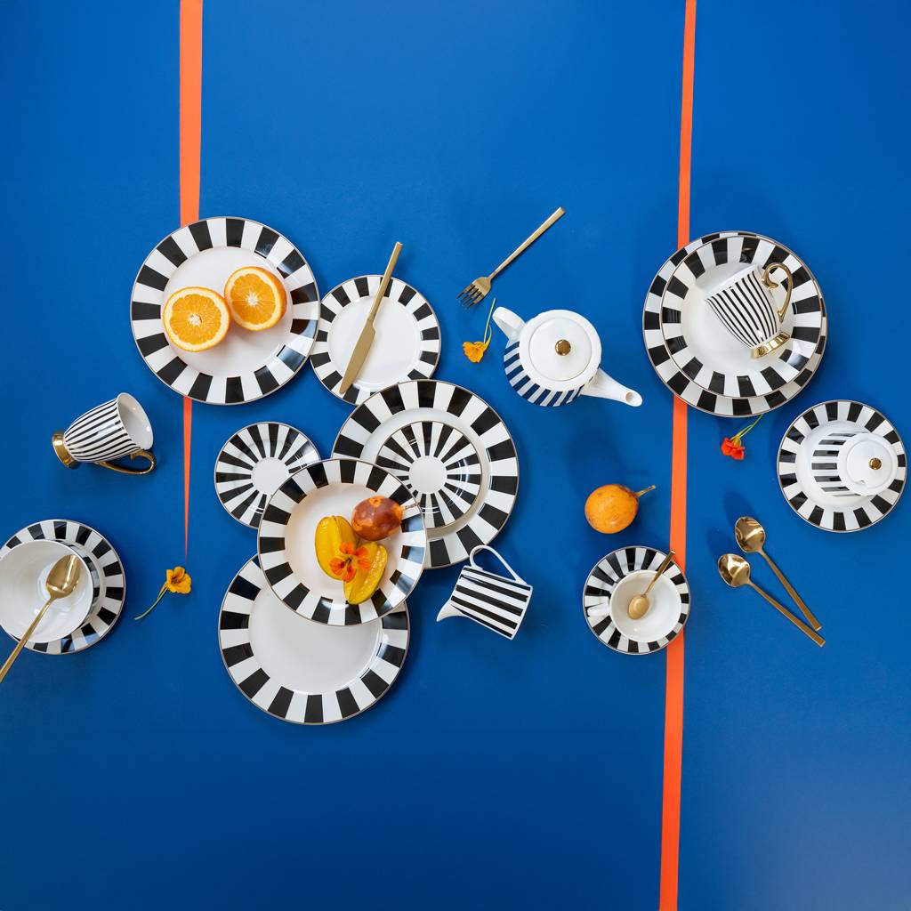 Contrasting stripes and golden accents introduce a fashion character to the table